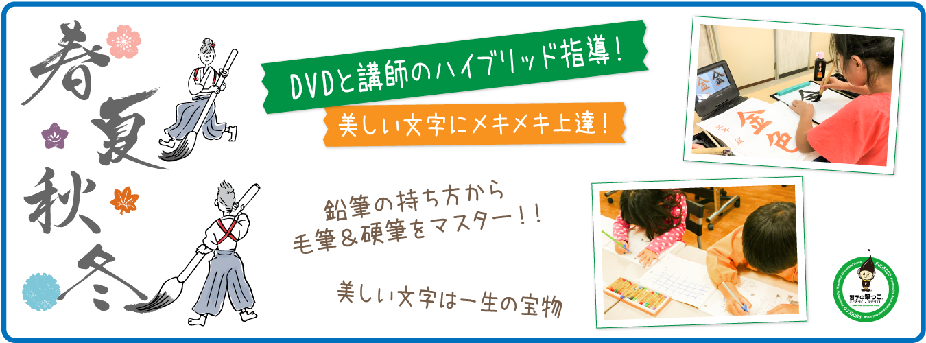 鉛筆の持ち方から、毛筆・硬筆まで学べる習字教室です。幼児(年長)から中学生まで、学べる2コース。 先生指導とDVD映像の「ビジュアル」指導のハイブリッド授業を採用しています。言葉と映像、両方のメリットを最大限活用してメキメキ上達!美しく整った文字の書き方を、ひとりひとりわかりやすく丁寧に指導。 公益財団法人日本習字教育財団の教材を使用します。